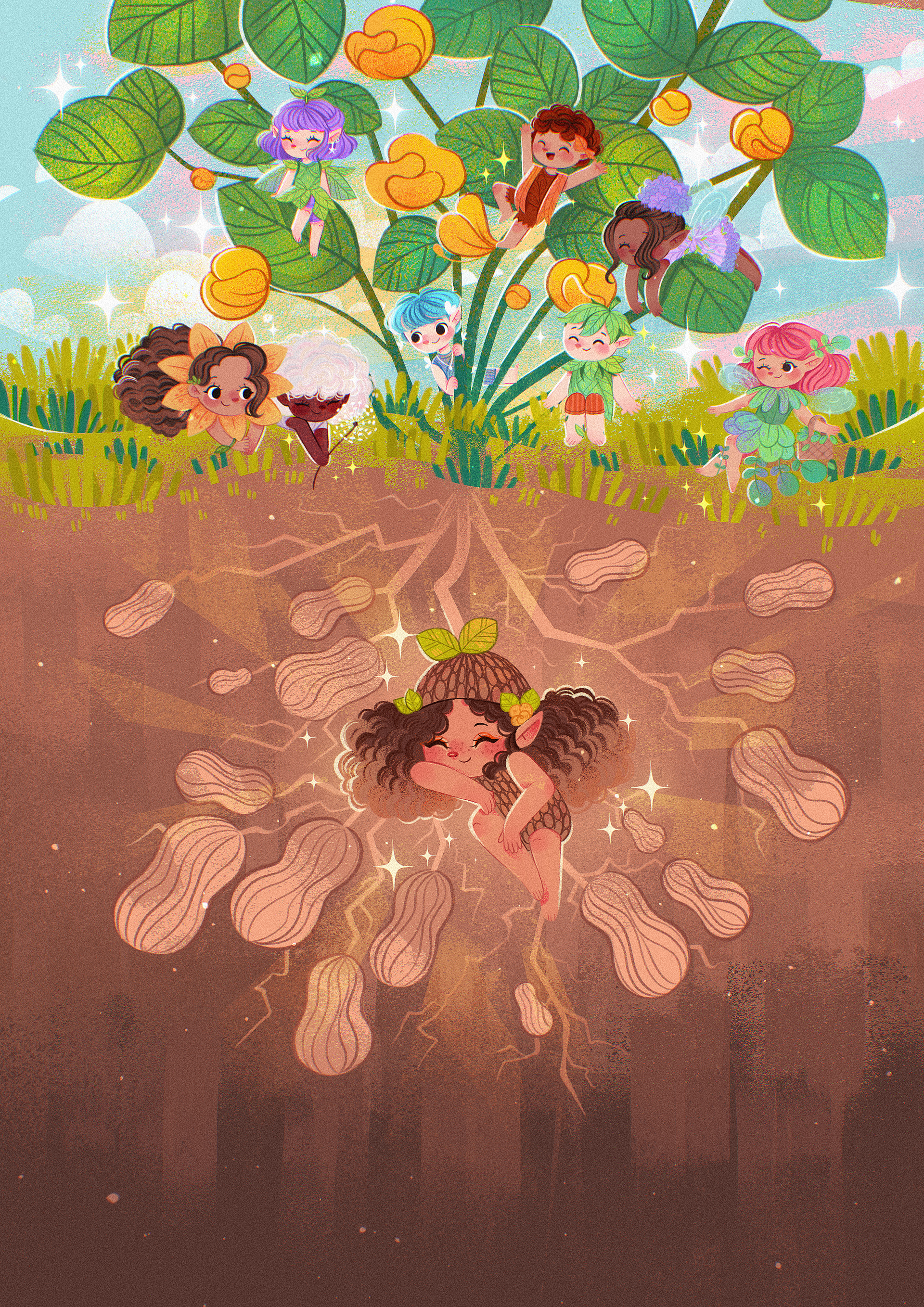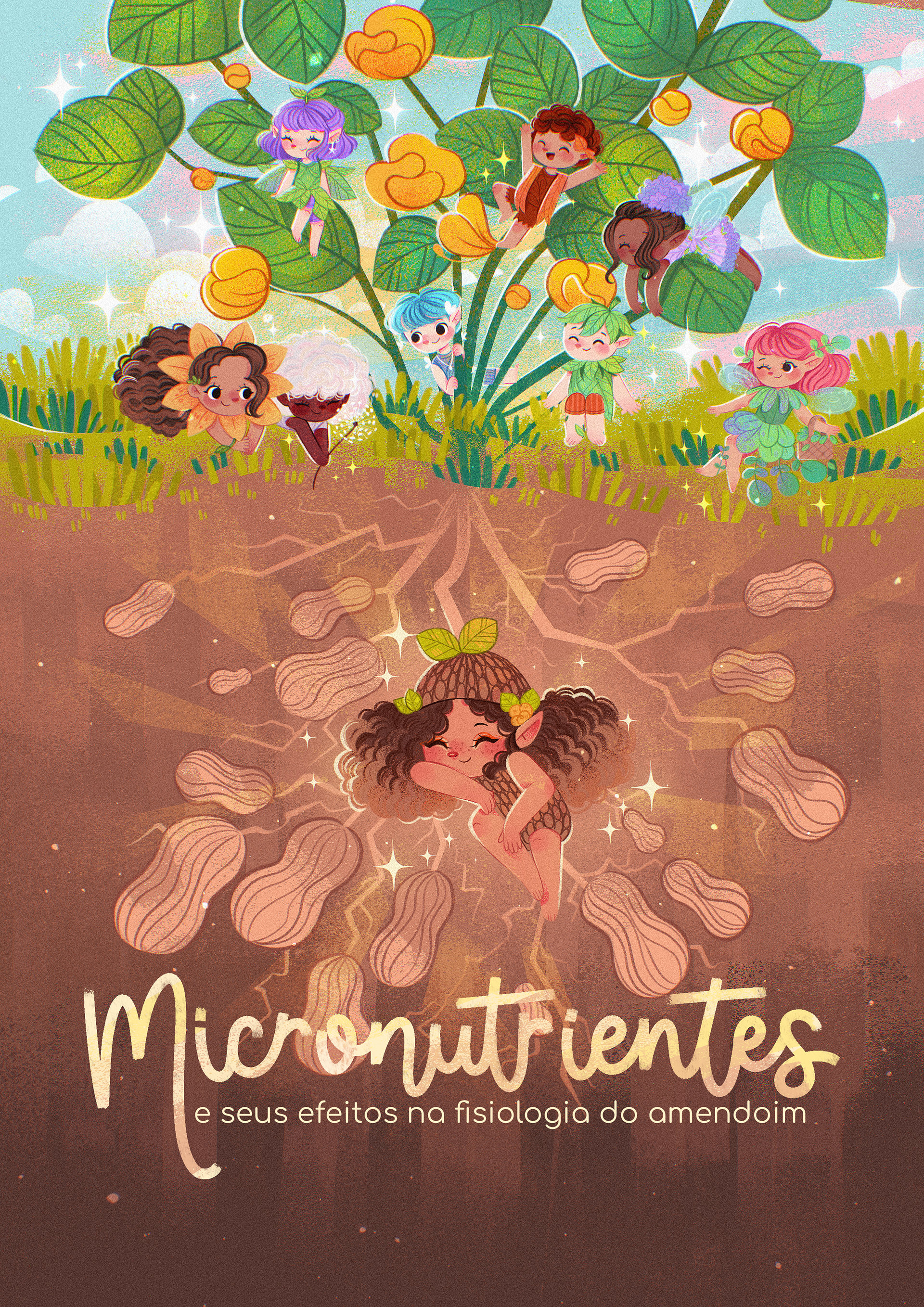 EN - My client had the brilliant idea of creating an e-book for her postgraduate work, which focused on peanuts and their micronutrients. The concept was to transform all this into a magical and whimsical universe.